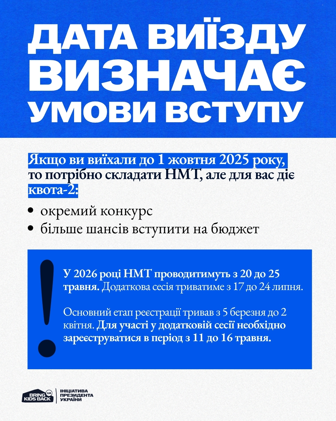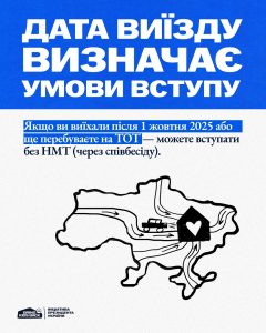 Якщо ви досі перебуваєте на ТОТ або виїхали після 1 жовтня 2025 року — вступ можливий без НМТ, через співбесіду в університеті. Якщо виїзд був раніше — потрібні результати НМТ, але діє квота‑2.