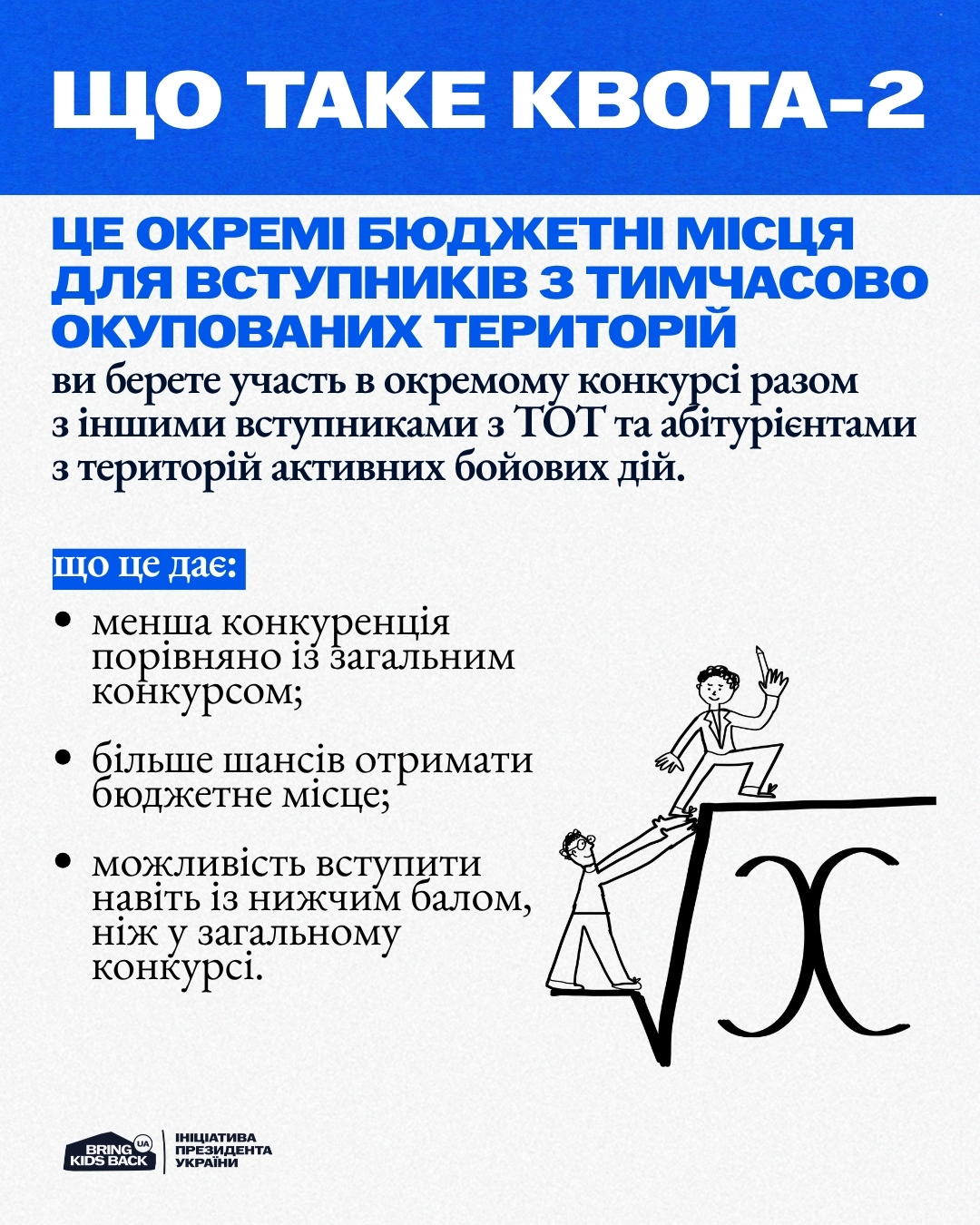 Квота‑2 — це окремі бюджетні місця для вступників з ТОТ і територій активних бойових дій. Вступ відбувається в окремому конкурсі, що дає більше шансів отримати бюджет. У більшості університетів це близько 10% місць, а в переміщених або прифронтових — до 40%.